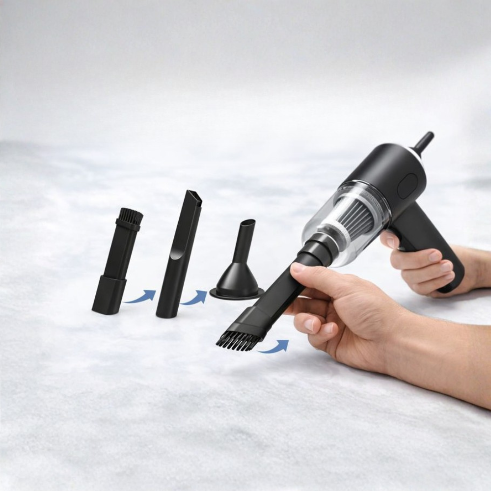 Discover the perfect portable vacuum for your car and home. With 60W of suction, it removes dust, crumbs, and debris in seconds. Its compact design and 1200 mAh rechargeable battery let you clean quickly without any cords. Comes with accessories for hard-to-reach corners and is easy to clean. Powerful, practical, and always ready to use.